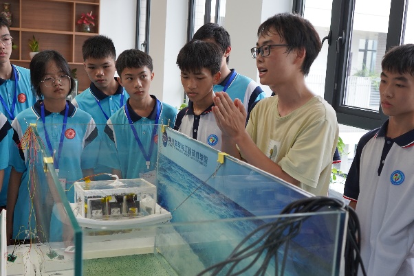 7月11日那坡中学的初中生们前来研学,在物理学院九楼的天象厅外,陈列着许多由物理学院师生参与研发的作品,志愿者向同学们详细介绍了学院参与的中国空间站上探测器项目,必赢nn699net官网主导研制的X射线偏振探测器(CXPD立方星)以及蓝色能源实验室研发的摩擦发电机。同学们近距离感受到了科技之美,埋下“科研的种子”。