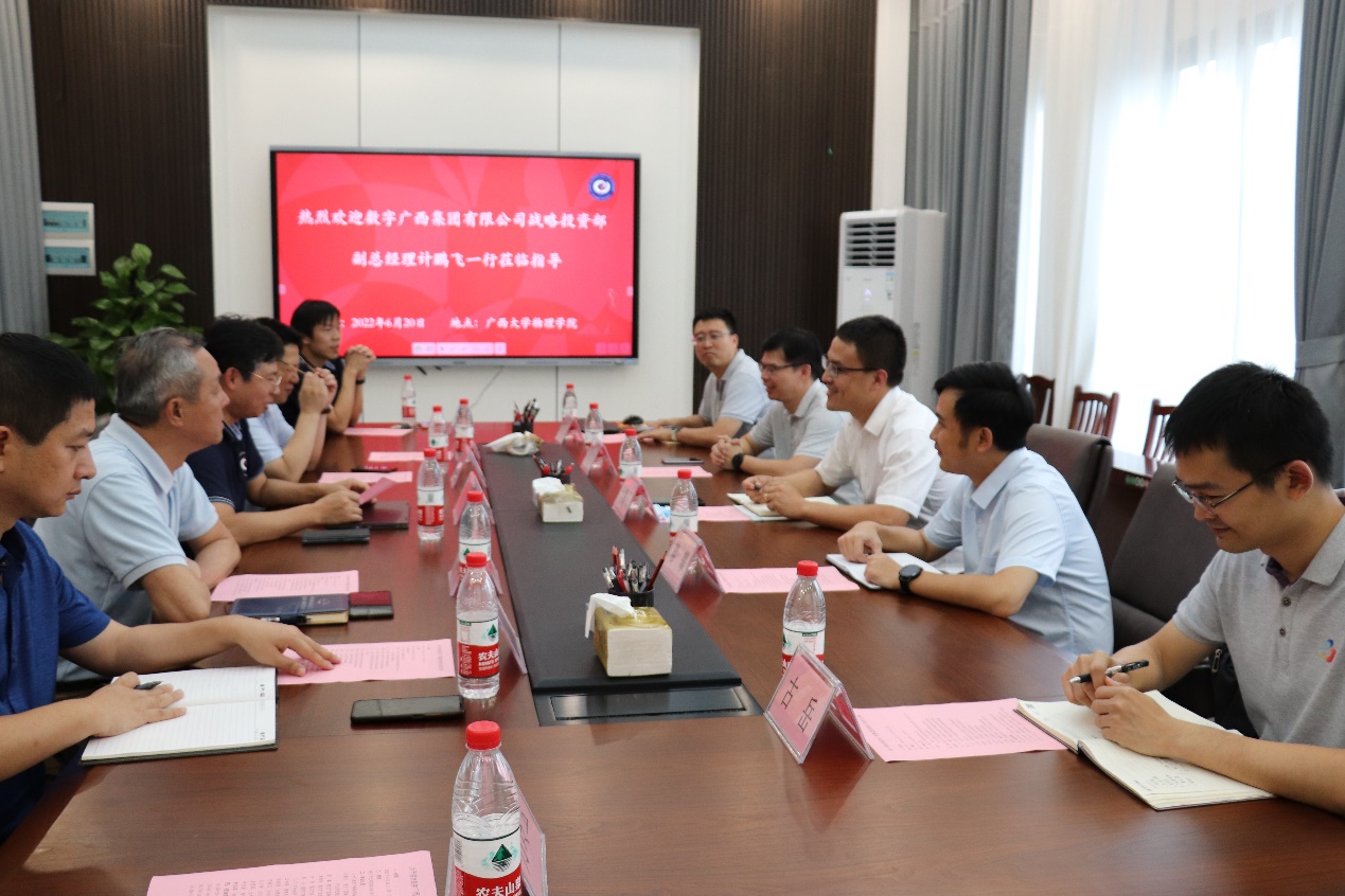 2022年6月20日下午,数字广西集团有限公司战略投资部副总经理计鹏飞一行到必赢官网考察调研,先后参观了洁净实验室、蓝色能源实验室、空间粒子探测实验室。校企双方随后举行座谈会,王祥高常务副院长主持会议。