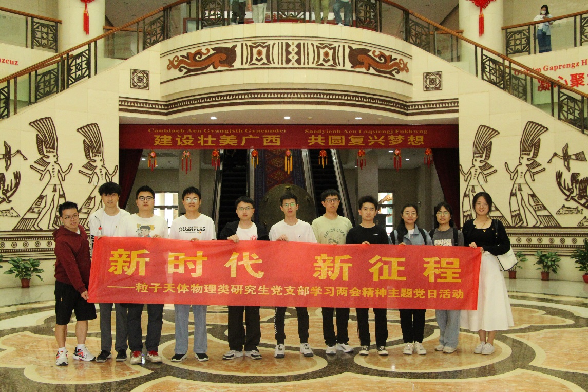 为深入学习宣传贯彻党的二十大精神和全国“两会”精神,弘扬广西优秀传统文化,培育和践行社会主义核心价值观,增进党支部的凝聚力,2023年3月18日,粒子天体物理类研究生党支部党员、入党积极分子前往广西民族博物馆开展“奋斗新时代,奋进新征程”主题党日活动。