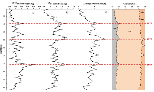 图3:YR2中 (a) 239+240Pu的比活度 (b) 137Cs的比活度 (c) 平均粒径 (d) 粒径组分(砂: 2000−62.5 μm, 粉砂: 62.5−3.9 μm, 粘土: 3.9−0.2 μm)