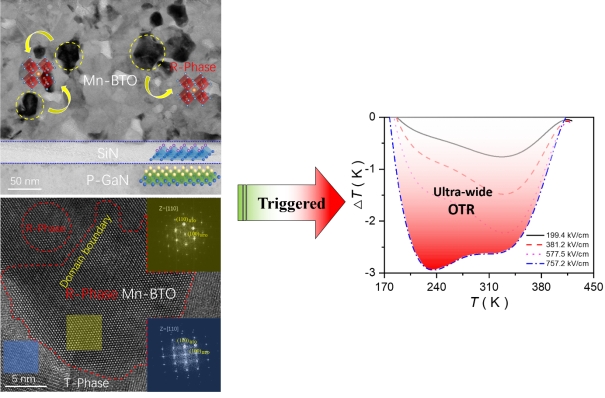 我们在SiN/p-GaN复合衬底Pt/Si衬底上使用溶胶凝胶法制备了掺Mn的BaTiO3薄膜(Mn-BTO)。结果表明,通过SiN/p-GaN复合衬底的调制作用,使得沉积在Pt/Si衬底上的Mn-BTO薄膜的负电卡效应由− 0.80 K提升至了− 2.94 K,同时工作温度范围(FWHMΔT)136 K扩宽到了186 KHRTEM测试证实了薄膜中间部位存在大量菱形相,这些菱形相极大地提升了薄膜的负电卡性能,同时验证了结构模拟计算的结果。该成果表明SiN/p-GaN复合衬底上制备铁电薄膜可以在整个薄膜中形成纳米级的菱形相,从而大大改善负电卡效应,为在宽工作温度范围内制备高负电卡性能薄膜提供了一条切实可行的途径。