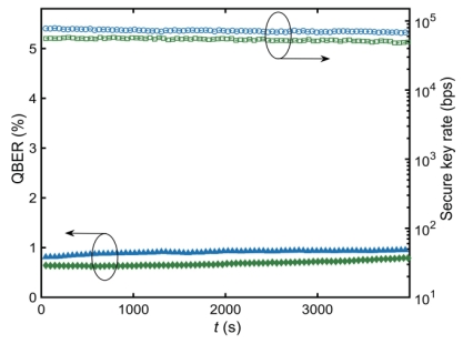图3:基于qubit同步的两用户量子接入网实验结果。每个用户的量子比特错误率和安全密钥率。量子比特错误率(实心菱形,用户1;实心三角形,用户2);安全密钥率(空心正方形,用户1;空心圆形,用户2)。