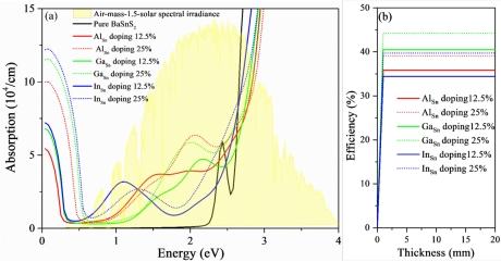 图2:纯净BaSnS2和以12.5%及25%的Al,Ga,In掺杂在Sn位的光吸收系数(a)和1个太阳光下的光吸收效率(b)
