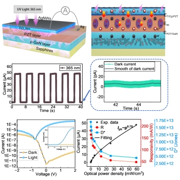 针对自驱动紫外光电探测器性能较低的问题,必赢官网蓝色能源研究团队与西安电子科技大学彭彪林教授合作,以p-GaN作为衬底,在铁电材料PZT中诱导显著的极化场,进而调控TiO2/PZT异质结,增强异质结内建电场。发展的AgNWs/TiO2/PZT/GaN双耦合自驱动紫外光电探测器,在365nm紫外光照射下获得了184.31 mA/W的响应度(R),62%的外量子效率(EQE),1.7×1013 Jones的比探测率(D*),0.16 ms/0.98 ms的快速上升/下降时间,以及8.1×106的高开关比。器件在持续照明下可保持稳定、高效的紫外光探测能力。该研究为发展高性能自驱动光电器件提供了一种有价值的途径。