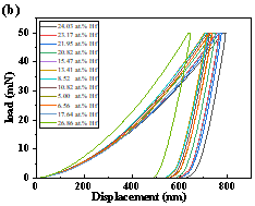 Indentation picture of Zr-Hf diffusion couple; (b) Displacement load curves corresponding to different Hf components in Zr-Hf diffusion couple [1].