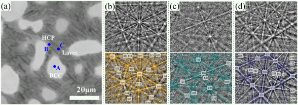 (a) The BSE image of the as-cast ZrNbTaHf0.2Cr0.75. The diffraction bands obtained from the A, B and C blue points in (a) are shown at the upside of (b), (c) and (d), respectively, while the simulated patterns generated by the crystal structure of BCC, HCP and C15 Laves are shown at the bottom of (b), (c) and (d), respectively [3].