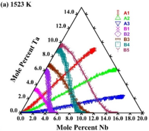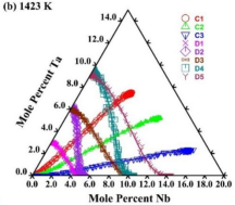 Diffusion paths for the Zr-Nb-Ta ternary diffusion couples annealed at (a) 1523 K and (b) 1423 K [2].