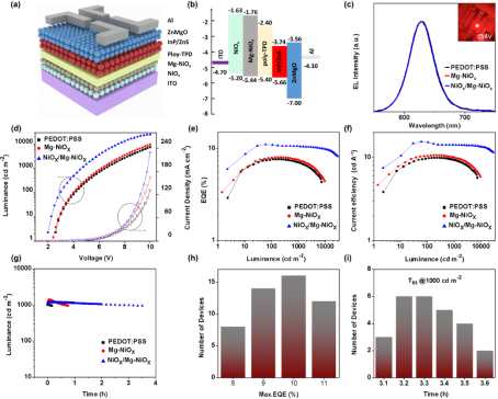 高性能InP基量子点发光二极管(QLED)的开发已成为当前环保显示和照明技术的发展趋势。然而,与已经投入工业应用的CdQLED相比,InPQLED的效率和稳定性仍然面临巨大挑战。近日,纳米光子学团队赵家龙教授研究组采用胶体NiOxMg掺杂NiOx纳米晶体来制备双层空穴注入层(HIL),以取代经典的PEDOT:PSS HIL来构建高性能InPQLED。与PEDOT:PSSHILQLED相比,双层HIL使器件的外量子效率从7.6%提高到11.2%,并且在1000 cd m-2的高亮度下,T95寿命延长了约7倍。研究发现器件性能的提高归因于双层HIL减少了空穴注入的失配势垒,并缩小了ITO/空穴传输层界面的势垒差,以促进载流子平衡注入,实现了高效辐射复合。本研究结果表明,使用具有pNiOx的双层HIL可能是制备高性能InPQLED的有效方法。