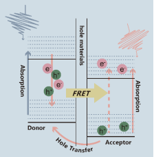 目前单结有机光伏电池(OSCs)的效率已经接近20%,高效的OSCs活性层主要是基于宽带隙的聚合物给体与窄带隙的非富勒烯受体(NFAs)小分子共混而成。由于给体的荧光光谱与受体的吸收光谱重合,可能发生由给体到受体的荧光共振能量转移(FRET)。此外,为了有效的电荷转移和高的内量子效率,需要大约0.5 eV的电离能(IE)偏移。因此,从给体到受体的FRET和从受体到给体的空穴转移可以潜在地提高OSCs的光电转换效率。
