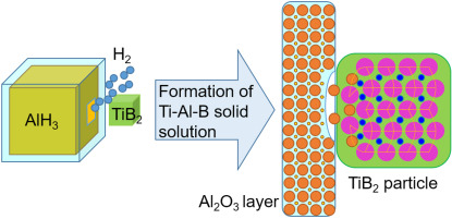 AlH3是一种亚稳态氢化物,储氢密度高达10.1 wt%,可在150–200 °C的低温下释放氢气。通过球磨引入添加剂(例如NbF5、TiF3等)可以显著降低AlH3的分解温度,但通常也会同时降低可用氢容量。针对这一问题,必赢官网新能源材料团队刘海镇副教授与合作者通过调控球磨工艺参数以及引入TiB2改善了AlH3的放氢性能。在225 rpm转速下球磨108 min的AlH3 + 2.5 wt% TiB2具有最佳的放氢性能,其起始放氢温度为78 °C,比单纯AlH3低60 °C,放氢在130 °C终止,可获得8.5 wt%的氢气。此外,在80 °C的恒定温度下,在200 min内可放出5.3 wt%的氢气,而在相同条件下,单纯的AlH3几乎不能释放任何氢气。用Kissinger方法计算的AlH3 + 2.5 wt% TiB2的放氢反应活化能为86 kJ mol−1,比单纯AlH3低28 kJ mol−1。催化机理研究表明,AlH3表面的Al2O3层会与TiB2相互作用,形成Al–Ti–B固溶体,导致晶格畸变,使得晶格活化,从而改善AlH3的放氢动力学。这项工作为实现亚稳态AlH3的高容量和低温放氢提供了一种有效的策略。