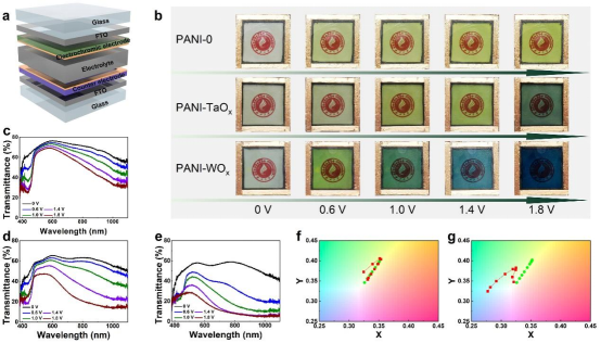 多色电致变色(EC)器件因其丰富的颜色变化而备受关注。多色EC器件中的主要障碍之一是缺少不影响工作电极色域的对电极。具有足够低着色效率的最小变色电极对于制备多色EC器件至关重要。在此,作者们演示了通过“一锅”热解法合成胶体非晶TaOx纳米线(NWs)作为最小变色电极来制备多色EC器件。发现胶体TaOx-NWs膜的表面粗糙度为4.4 nm,显示出良好的成膜性能。TaOx-NW电极在EC器件中表现出高透射率和最小的颜色变化。作为概念证明,通过使用TaOx-NW膜作为对电极和聚苯胺(PANI)作为工作电极来制备了多色EC器件。发现NW膜对电极可以在器件操作中完全保持PANI的真实颜色,并且还平衡了在器件运行期间由EC电极产生的电荷,从而缩小了EC器件的工作电压和更快的动态响应。这项工作为制备高性能多色EC器件提供了新方案。