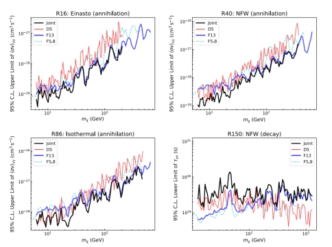 本工作相于之前工作的重大创新点在于同时采用了DAMPEFermi-LAT的数据来进行此类搜索。据我们所知,这是首个联合两个不同的伽马射线卫星观测数据的暗物质探测工作。联合分析有效地降低了仪器的系统误差,提升了结果的可靠性。同时得益于DAMPE的高能量分辨率,DAMPE数据的加入,显著降低了在单Fermi-LAT数据分析中,由于考虑系统误差所带来的灵敏度丢失,得到了迄今最好的限制结果。