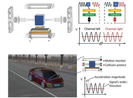 本研究提出了一种基于栅格结构的摩擦纳米发电机(GF-TENG)的加速度传感器,能够在低至百微米的尺度上实时感知位移、速度和加速度。通过将弹簧和GF-TENG组装成GTAS,可以将加速度感应范围扩大到所需的范围,该传感器可用于车辆约束系统以保护乘客。