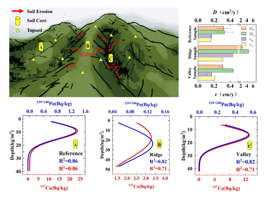 利用对流扩散方程(CDE)模型定量描述239+240Pu和137Cs的垂直迁移行为。在土壤侵蚀影响下,山脊岩心中两种核素的对流扩散系数高于一般土壤,并且由于239+240Pu和137Cs与土壤的结合机制不同,前者的对流速度比后者加快了约40%,与常规土壤中的同步迁移行为有明显差异。