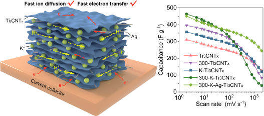 针对以上出现的问题,结合已有理论。必赢官网新能源团队通过对Ti3CNTx基电极材料进行钾离子插层及表面改性,并进一步在Ti3CNTx层间引入银纳米线,得到了兼具高比电容和高倍率性能的300-K-Ag-Ti3CNTx电极材料。300-K-Ag-Ti3CNTx电化学性能的提高可归因于Ti3CNTx层间距的增加和表面官能团浓度的降低以及高导电性。实验结果表明,在纳米片之间插入阳离子并降低官能团浓度可以显著提高Ti3CNTx的质量比电容,在引入K+并去除官能团(-OH,-F)后,质量比电容大幅提高到464 F g-1。Ti3CNTx 基薄膜的电导率受层间阳离子和表面官能团的影响。300-K-Ag-Ti3CNTx薄膜的电导率增加到1030.93 S cm-1,并显示出优异的倍率性能,即使在2000 mV s-1下,其质量比电容也可以保持在245 F g-1。表现出优异的倍率性能。基于300-K-Ag-Ti3CNTx薄膜的全固态对称超级电容器在350 m W g-1时显示出6.9 mWh g-1的高能量密度,表明它们在柔性储能装置方面有很大的应用潜力。这项工作将进一步推动柔性MXenes基电极的研究;特别是Ti3CNTx基电极,在超级电容器和可穿戴电子设备领域具有广阔的应用前景。
