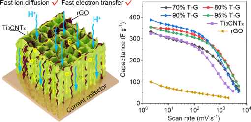 为了解决以上所述问题,必赢官网新能源团队设计了三维垂直多孔Ti3CNTx基复合气凝胶以助力超级电容器倍率性能的提升。将石墨烯(rGO)与Ti3CNTx结合,并通过单向自下而上的冻结过程制备Ti3CNTx/rGO复合气凝胶,构建垂直的离子扩散路径。石墨烯纳米片的嵌入可以有效减弱Ti3CNTx纳米片的再堆积,扩大MXenes层间距,提高材料利用率。此外,石墨烯纳米片的加入也可以提高混合气凝胶的机械强度,并在MXenes纳米片之间提供高导电网络。垂直多孔结构大大缩短了离子的扩散路径,提高了电解液离子的可及性。Ti3CNTx/rGO混合气凝胶的比电容可达390 F g-1,尤其在1000 mV s−1下仍能保持205F g-1的高比电容。组装的全固态对称SCs在154 mW g -1的功率密度下可提供5.0 mWh g -1的高能量密度,并具有良好的循环稳定性。所采用的单向自下而上的冻结过程简单、易于操作,可扩展到其他MXene基混合气凝胶的制备,促进了MXenes和其他二维纳米材料在高功率超级电容器中的应用。
