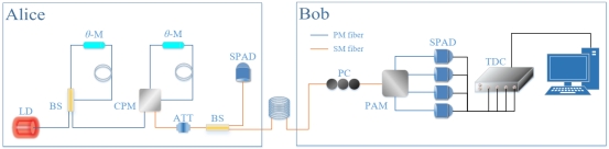 图1: BB84 QKD实验装置原理图。
