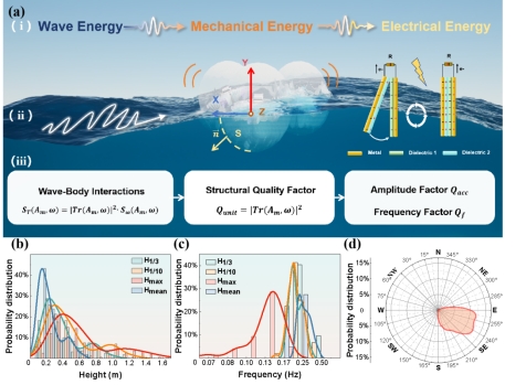 现阶段波浪能和TENG壳体机械能之间的能量转换关系还未有系统的研究。这导致基于现有评价因子设计的TENG在海浪环境中发电单元的摩擦层或接触层难以按照理想状态展开,导致器件可靠性差和电能转换效率低且不稳定的问题。另一方面,评判TENG器件波物耦合适配程度的标准尚未完善。这导致不同形状壳体间的波浪能吸收和转化能力难以比较。因此,有必要基于真实海浪的随机特性,从统计学和能量转化的角度提出量化评估壳体对波浪能吸收能力的结构品质因数。这对设计高效采集波浪能的TENG器件和内部采能方向的选择具有重要意义。为了解决上述问题,本文引入随机波浪理论和谱分析法,从统计学和能量转化的角度出发提出了用于定量评估海上漂浮式摩擦纳米发电机(Flo-TENG)壳体及其对波浪能吸收转化能力的结构品质因数(Qunit)。并根据海浪周期和波高的作用特性将其分为振幅结构品质因数(Qacc)以及频率结构品质因数(Qf)。此外,本文还系统性地研究了各个壳体参数对Qunit的影响。通过一系列的研究发现:波浪作用在器件的不同轴向上产生了不同的能量吸收和转化行为,即壳体对能量的吸收和转化具有轴向性;正方形器件的能量吸收主要来自Z向的贡献,四棱台、圆台和半球型器件的能量吸收主要来自三个轴向的共同贡献等。该成果以“Structural Quality Factor of Flo-TENG under Stochastic Wave Excitation”为题发表在学术期刊《Advanced Science》(IF=14.3)上,必赢nn699net官网为第一通讯单位。