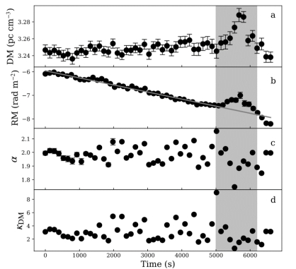 近日,以必赢nn699net官网物理学院为第一单位,来自北京大学、国家天文台、云南大学和中国科学院大学的研究人员。利用中国天眼FAST对正常射电脉冲星B1929+10进行110分钟的长时间跟踪观测,发现该脉冲星的光变曲线在20分钟左右下降3个甚至超过3个数量级。且在低于1150MHz频率上(黄色斑带),发现等离子透镜效应,如图1所示所示。与此同时,色散量(DM)和旋转量(RM)也发生显著的变化,其变化强度分别为0.05 pc cm⁻³和0.7 rad cm⁻² ,如图2所示。
