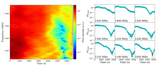 进一步分析,研究人员发现,在1GHz以上,还间接探测到散射效应。该效应随观测频率的负4次方衰减,一般认为在高于1GHz的观测频率上,不存在散射效应或者该效应对射电信号的影响极其微弱。这一例极端的流量事件,对于研究人员理解脉冲星辐射及其星际介质环境至关重要,同时可能影响着纳赫兹引力波的探测。该研究成果以题目: An Extreme Radio Fluctuation of Pulsar B1929+10,已于北京时间2024年10月19日被国际天文学杂志The Astrophysical Journal Letters 接收。