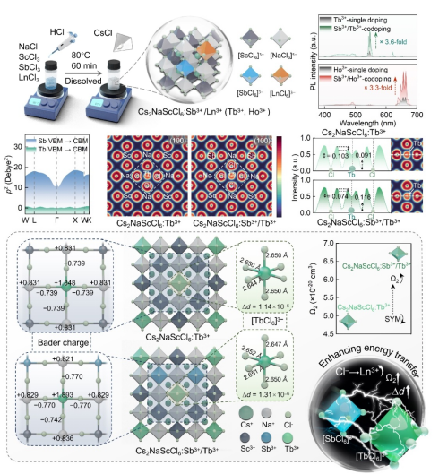 ns2电子金属能显著增强钙钛矿的发光效率,但是其内在机制仍不清楚,我们的研究表明,Sb3+离子的掺杂不仅提高了能量转移效率,而且改变了稀土基双钙钛矿的局域电子和晶格结构。密度泛函理论和Judd-Ofelt理论的计算提供了明确证据,Sb3+离子的掺杂使[LnCl6]3–八面体中的电荷密度更加局域化。此外,Ln3+周围环境的对称性降低,促进了Ln3+的辐射跃迁速率,同时提高了能量转移效率。与Cs2NaScCl6:Ln3+相比,Cs2NaScCl6:Sb3+/Ln3+的能量转移效率提高了1.5倍,高达98.3%。我们的研究进一步揭示了ns2电子金属离子掺杂增强能量转移过程的内在机理,为理解钙钛矿光物理过程的研究提供了参考。