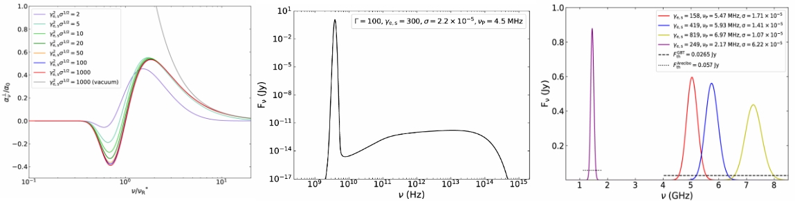 图2:同步辐射自吸收系数随频率的变化(左)和同步脉泽辐射随频率的变化(中)以及在不同参数范围预测的在GBT和Arecibo望远镜带宽内观测爆发的频谱轮廓(右)