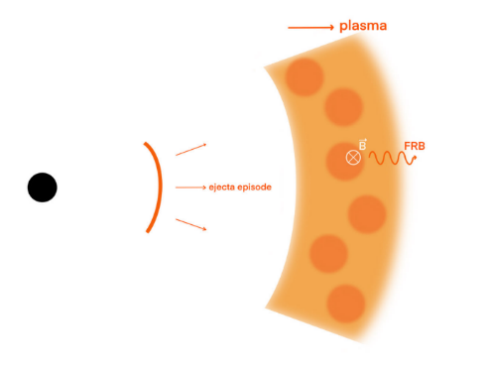 图1:rFRBs爆发的模型卡通图,来自中心引擎的ejecta触发了等离子体不稳定性,诱导产生局部电子等离子体blob,从而通过同步脉泽辐射产生快速射电暴