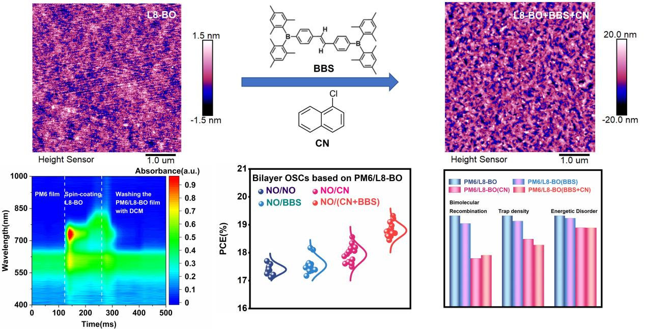 针对以上问题,必赢官网薄膜光伏研究团队使用“固-液混合添加剂”策略,有效调节双层结构中非富勒烯受体(NFAs)分子的堆积,从而改善NFAs分子的排列有序性。我们观察到,当L8-BO薄膜使用溶剂添加剂1-氯萘(CN)处理时,通过J-聚集增加了结晶度,从而实现了分子的边缘取向和纤维状网络结构。在将固体添加剂反式-双(二甲基苯基硼)苯乙烯(BBS)进一步加入L8-BO溶液后,其中BBS是一种具有多发射位点的荧光有机硼衍生物,它有助于L8-BO分子的紧密有序堆积,改善了薄膜的有序性,并形成了絮状结构。随后,与PM6配对通过顺序旋涂法制备了双层OSCs,以研究器件性能与形貌诱导的分子有序性之间的关系。结果显示,参考器件的PCE仅为17.70%,而加入CN后,性能提升至18.56%,这主要归因于填充因子(FF)的显著变化。进一步加入BBS,FF和短路电流密度(JSC)进一步增加,实现了19.32%的PCE,这是双层器件中最高的值之一。我们将器件性能的提升归因于减少的缺陷复合,从而提高了电荷提取和分离效率。而且,形貌的变化也引起了优异的性能稳定性,当1500h的储存时间后,仍然维持了初始效率的91%。这项研究的结果揭示了双添加剂对NFAs形貌的调制作用,对于实现高效的双层有机光伏电池影响深远。