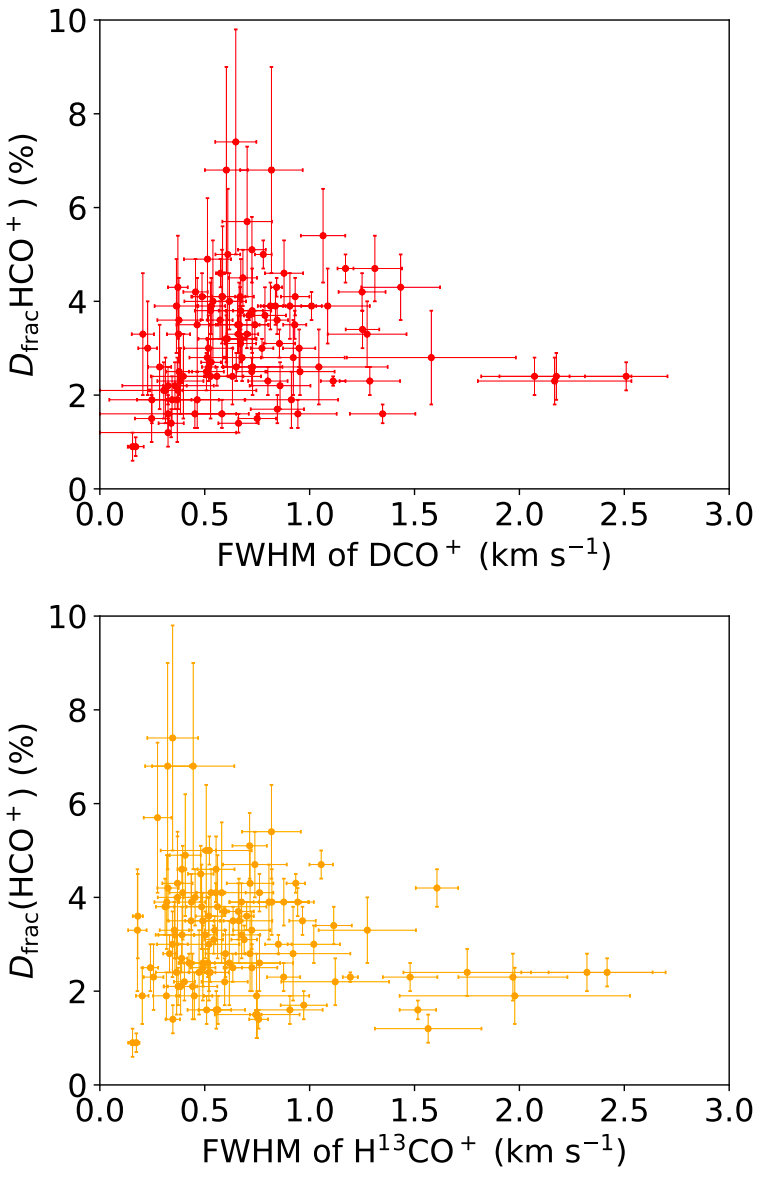 DCO+H13CO+ J=1–0的线宽(FWHM)主要分布在1km s−1以内,说明普朗克冷核是比较安静的源,二者线宽与氘化率无显著关系(如图3所示)。