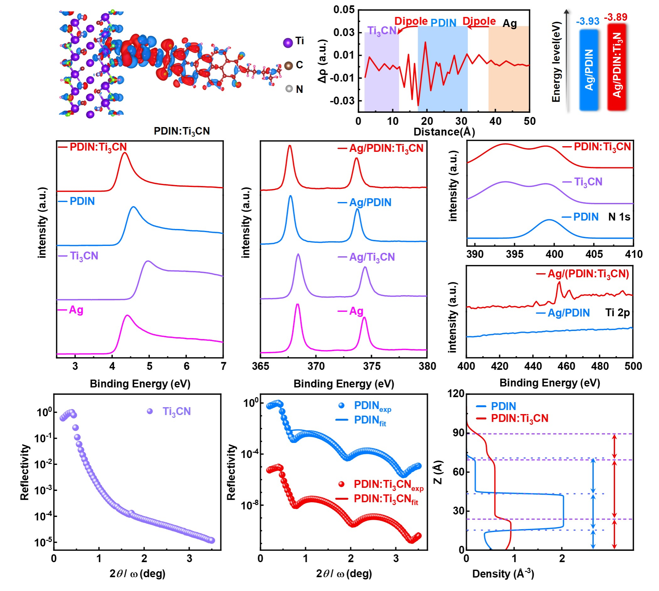 针对以上问题,必赢官网薄膜光伏团队联合四川大学和淮北师范大学采用混合阴极界面层策略(将具有高光学透明度和优异导电性的MXenes二维材料Ti₃CN,修饰PDI及其衍生物)调控PDI分子的聚集行为,揭示Ti₃CN与PDI界面层的N-N耦合作用机制。当在PDIN中引入1 wt%的Ti₃CN时,Ti₃CN表面钛原子通过电子转移与含有氨基的PDIN形成定向偶极结构。N-N相互作用下Ti₃CN:PDIN混合阴极界面层有更合适的能级匹配,增强导电性,从而提升电荷提取性能。此外,Ti₃CN的引入有效调控了PDIN薄膜的垂直相分布,使PDIN更加致密有序,降低陷阱态密度,形成更光滑的表面,从而构建高效的电子传输路径,显著增加了阴极界面层的膜厚耐受性。将该界面层应用于PM6:BTP-eC9和PM6/L8-BO有机太阳能电池器件时,分别实现了20.0%和19.5%的PCE,器件稳定性得到提升。本研究提出的N-N耦合策略为开发高效有机太阳能电池混合阴极界面层提供了新的见解。
