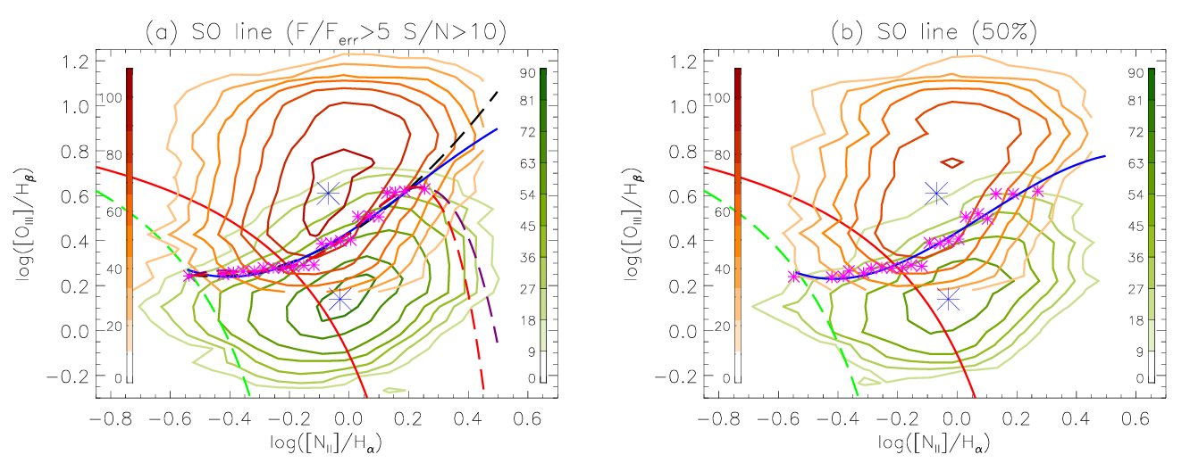 在该项工作中,考虑到目前在[NII]分类图中并没有明确的SeyfertLINERs的分界线,我们提出了一个优化的方法,对该分界线进行了标定,并且基于该分界线,首次报道了1型和2AGN中的数目比与LINERs的数目比有较大的差异,从而为非AGN起源的LINERs或者naked LINERs的后续研究打下了基础。后续关于1型以及2LINERs的研究正在有序进行中。