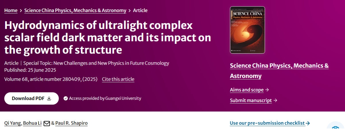 近日,我院宇宙学团队在暗物质研究领域取得新进展。研究结果以题目为“Hydrodynamics of ultralight complex scalar field dark matter and its impact on the growth of structure”的论文发表在中国科学院一区期刊Science China Physics, Mechanics & Astronomy (SCPMA)。论文的第一作者为必赢官网2023级硕士研究生杨祺,通讯作者为必赢官网助理教授李博华。我校为论文的第一单位及唯一通讯单位。